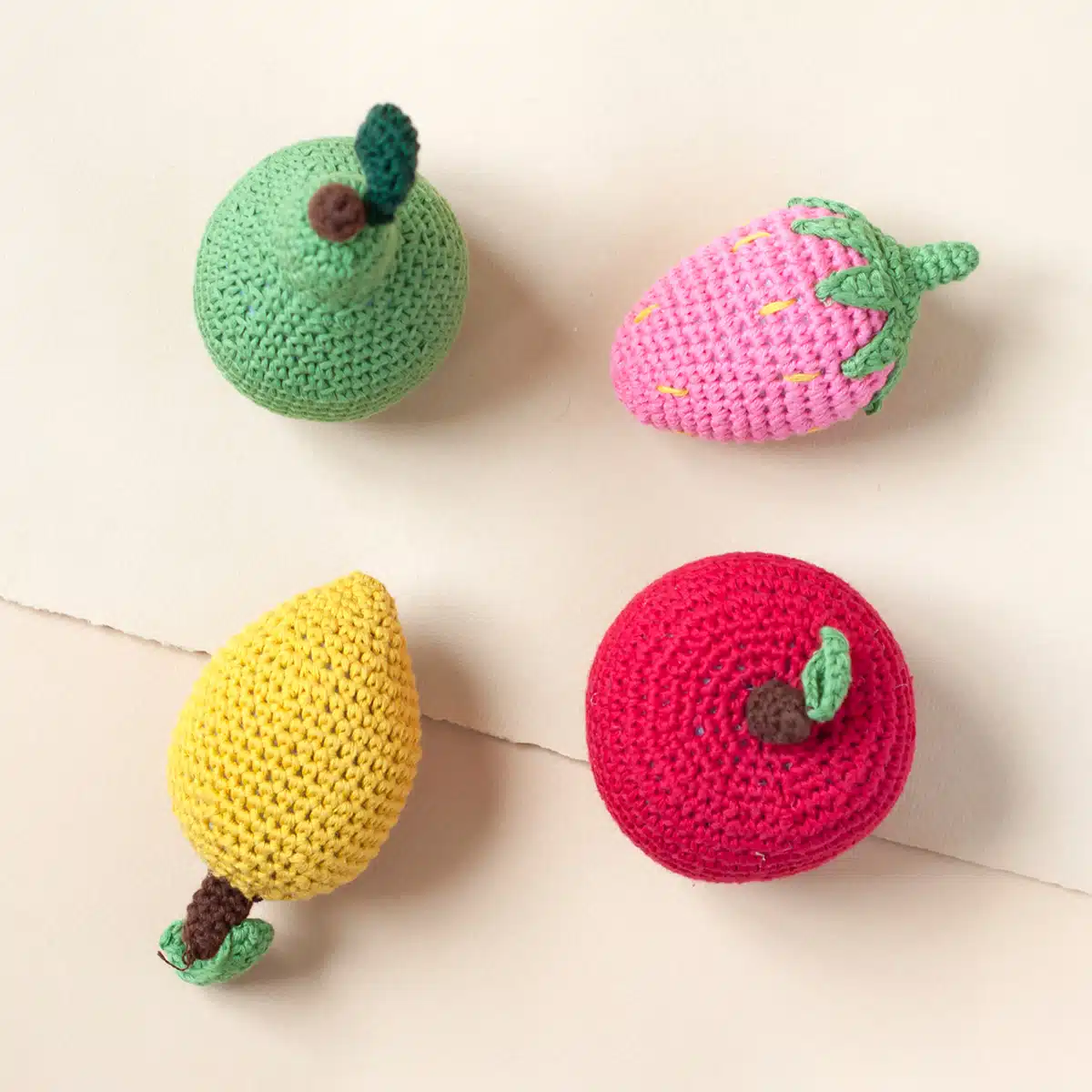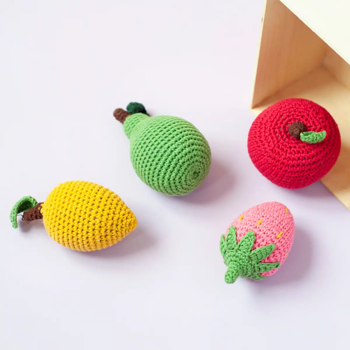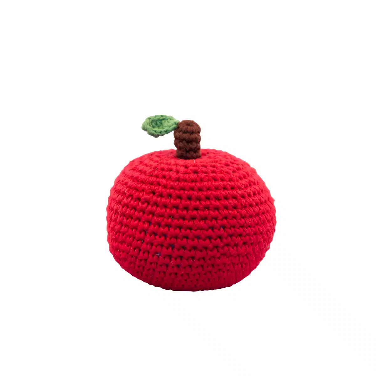 Een vrolijke, zachte, handgemaakte rammelaar in de vorm van een appel.