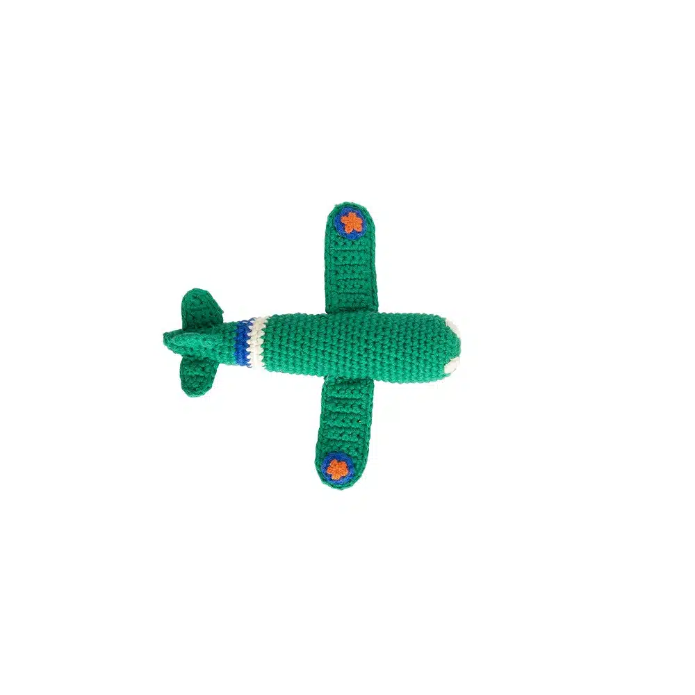 Een vrolijke, zachte, handgemaakte rammelaar in de vorm van een vliegtuig.
