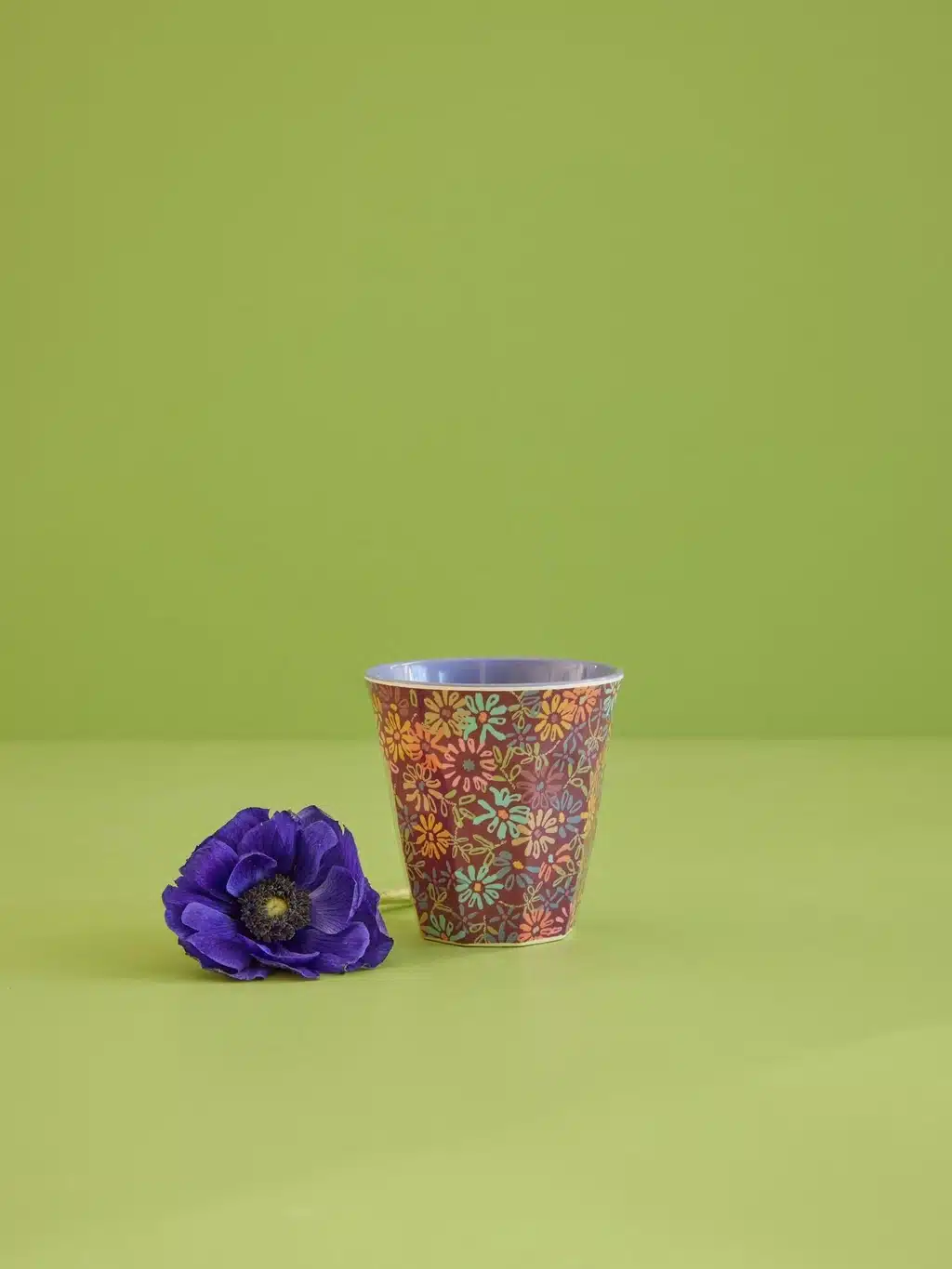 De klassieke melamine beker van Rice in een warme bloemenprint met een paarse binnenkant.