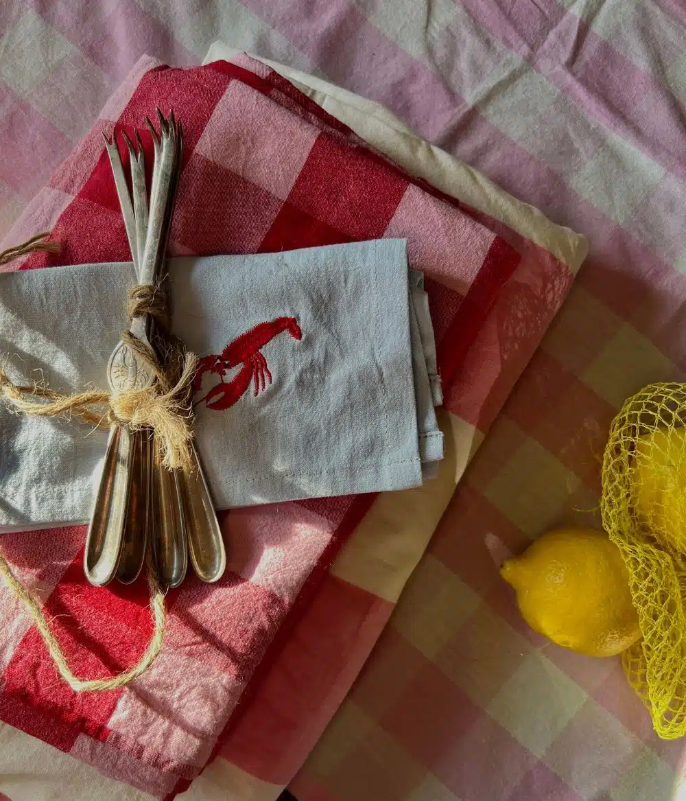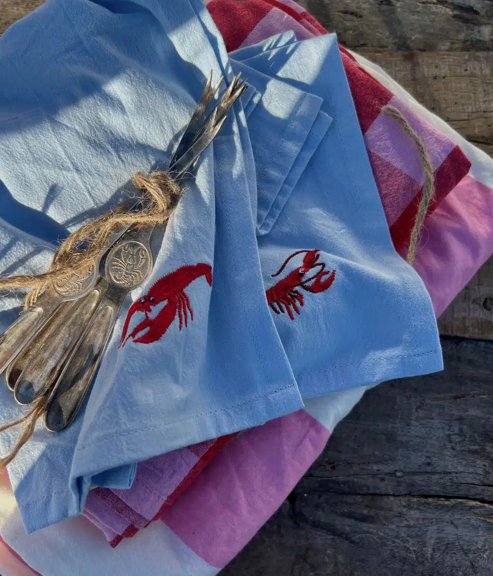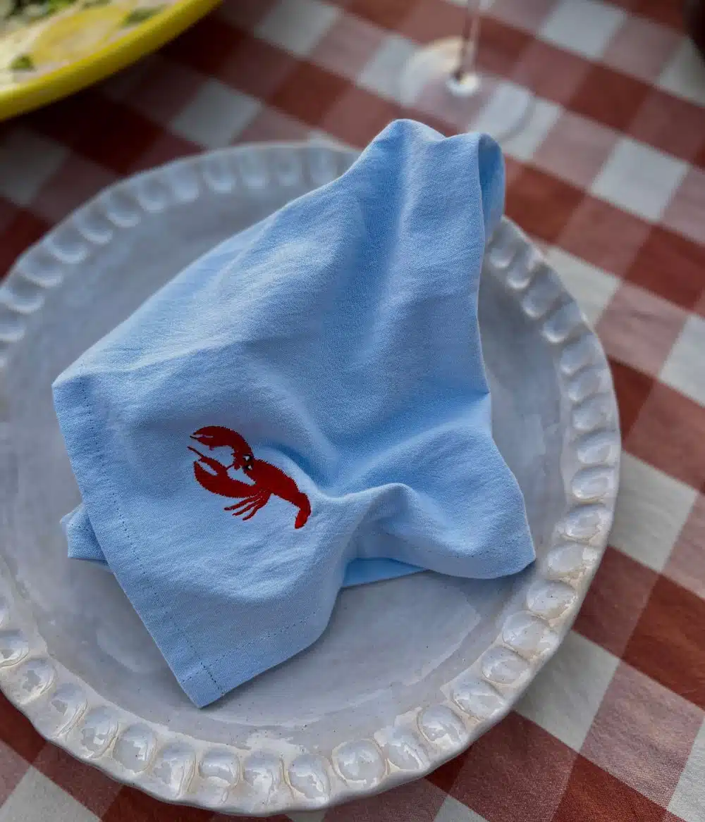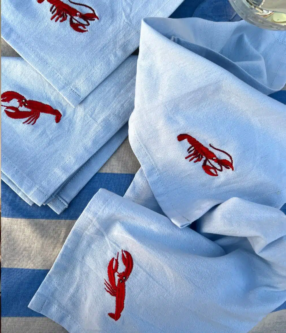 Met deze zomerse servetten fleur jij jouw gedekte (buiten)tafel helemaal op! Deze biologisch katoenen servetten worden geleverd in een set van vier. Elk servet is geborduurd met een rode kreeft of een rode rivierkreeft (van beide 2). De stof is lichtblauw van kleur en de afmeting van elk servet is 40×40 cm.
