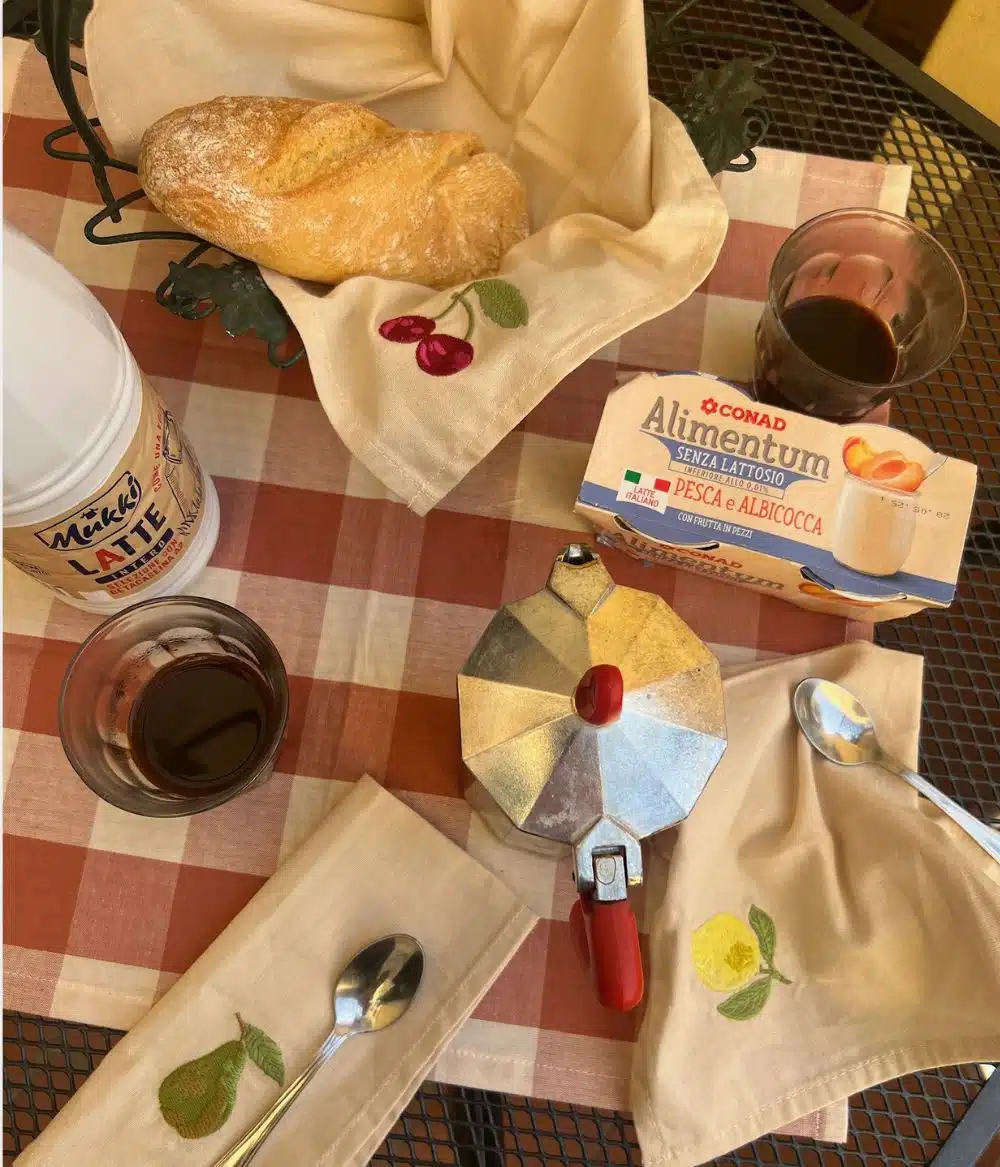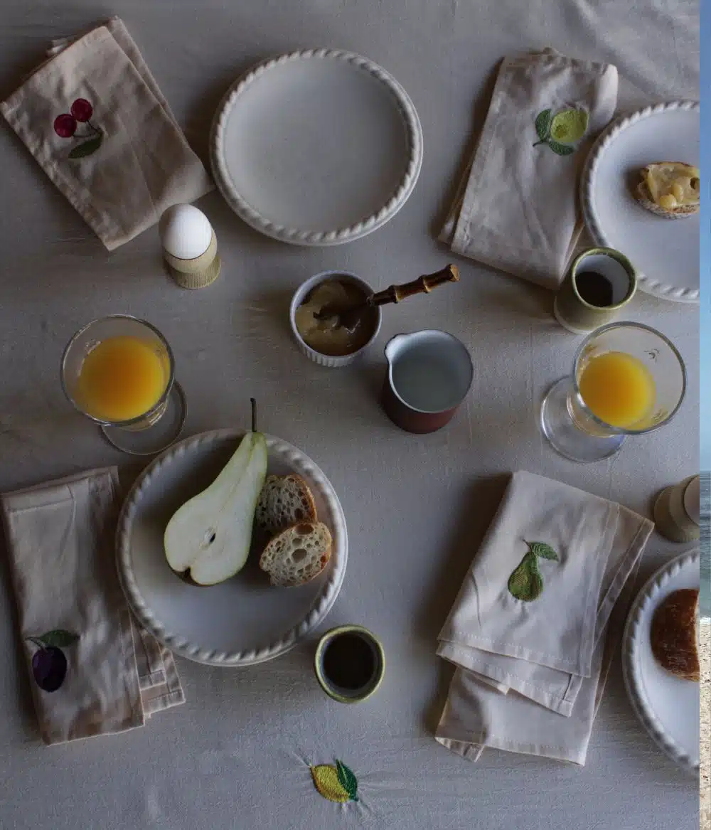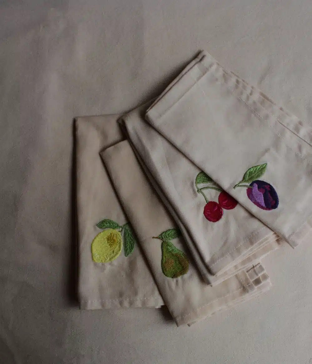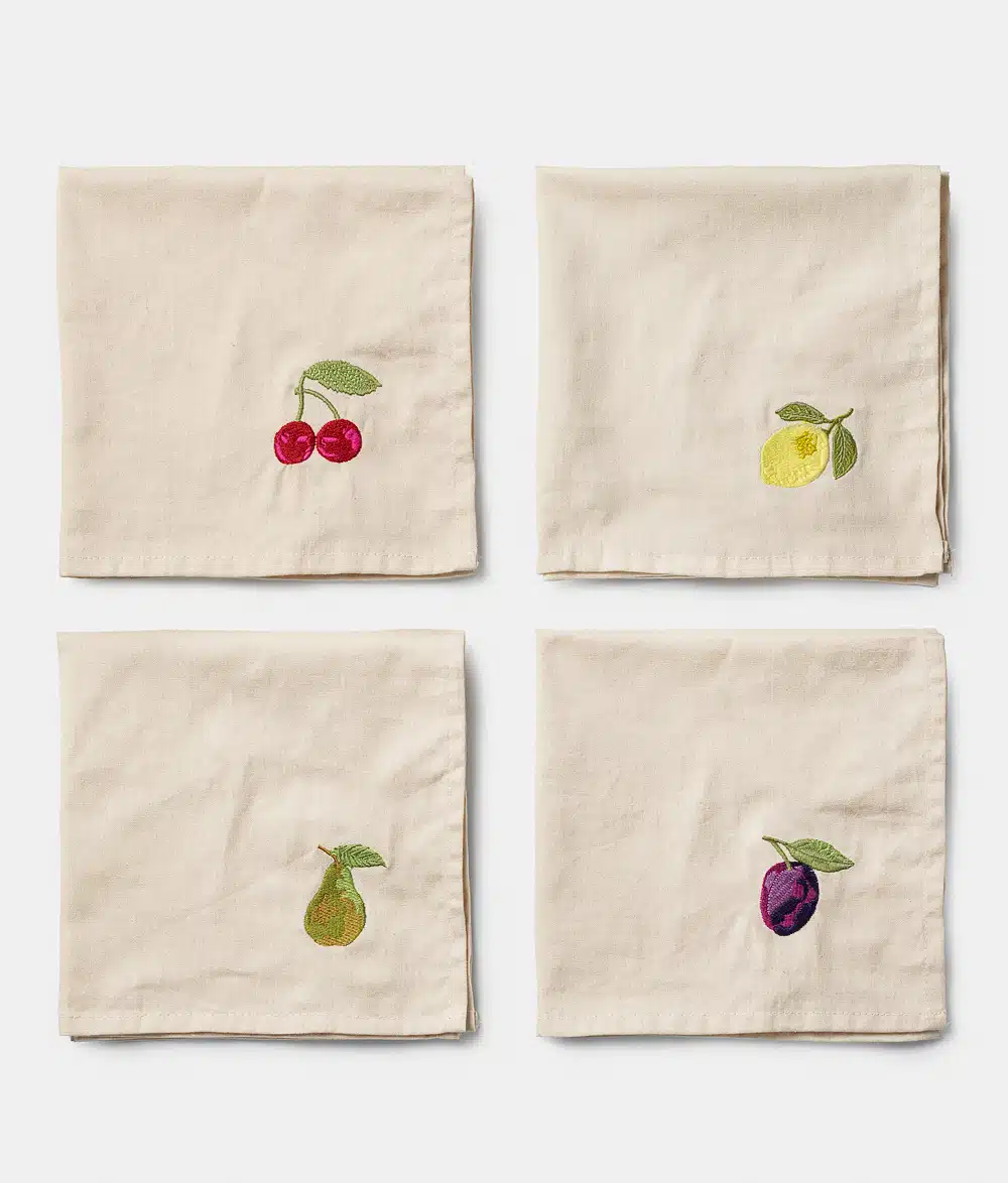 Met deze vrolijke Tutti Frutti servetten geef jij jouw zomers gedekte tafel nog net dat beetje extra! Deze biologisch katoenen servetten worden geleverd in een set van vier. Elk servet is geborduurd met een soort fruit: peer, citroen, kers en pruim. De stof is zacht beige van kleur en de afmeting van elk servet is 40×40 cm.