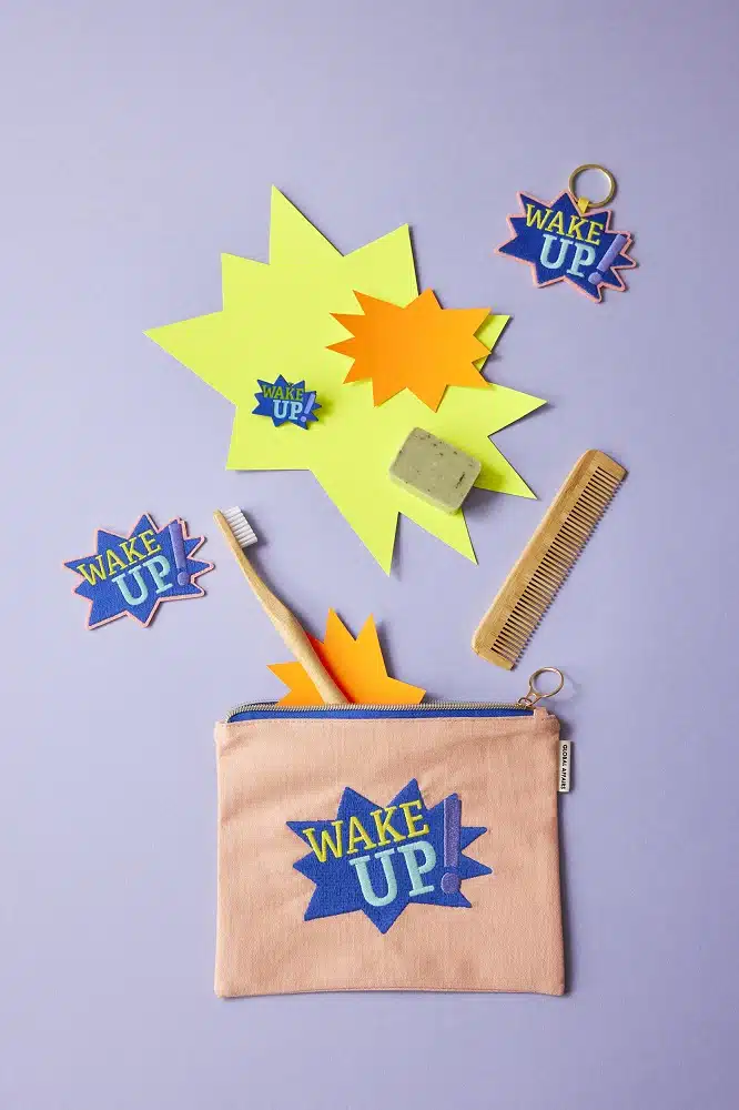 Stoffen sleutelhanger met de tekst “Wake Up.” Voeg wat persoonlijkheid toe aan je sleutelbos, tas of rugzak. Perfect als klein cadeautje of gewoon om jezelf te laten glimlachen.
