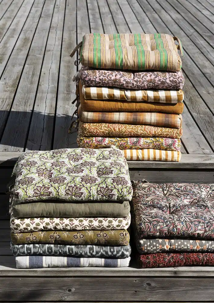Kleurrijk stoelkussen geïnspireerd op originele Indiase blokprints.