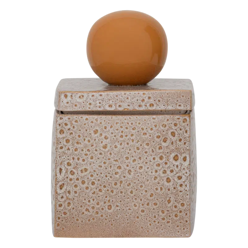Een stoere en tactiele gerecyclede keramische pot met een dikke oranje handgreep en een reactieve glazuurafwerking. Perfect voor het opbergen van dagelijkse benodigdheden in de keuken, badkamer of woonkamer. Duurzaamheid en stijl komen samen in dit veelzijdige woonaccessoire.