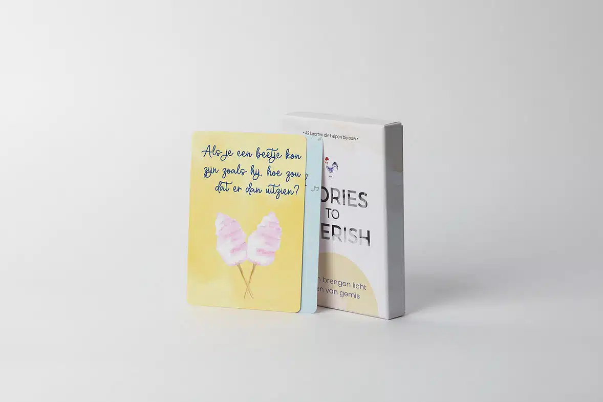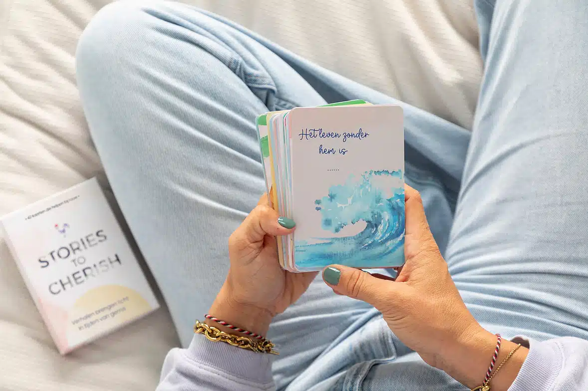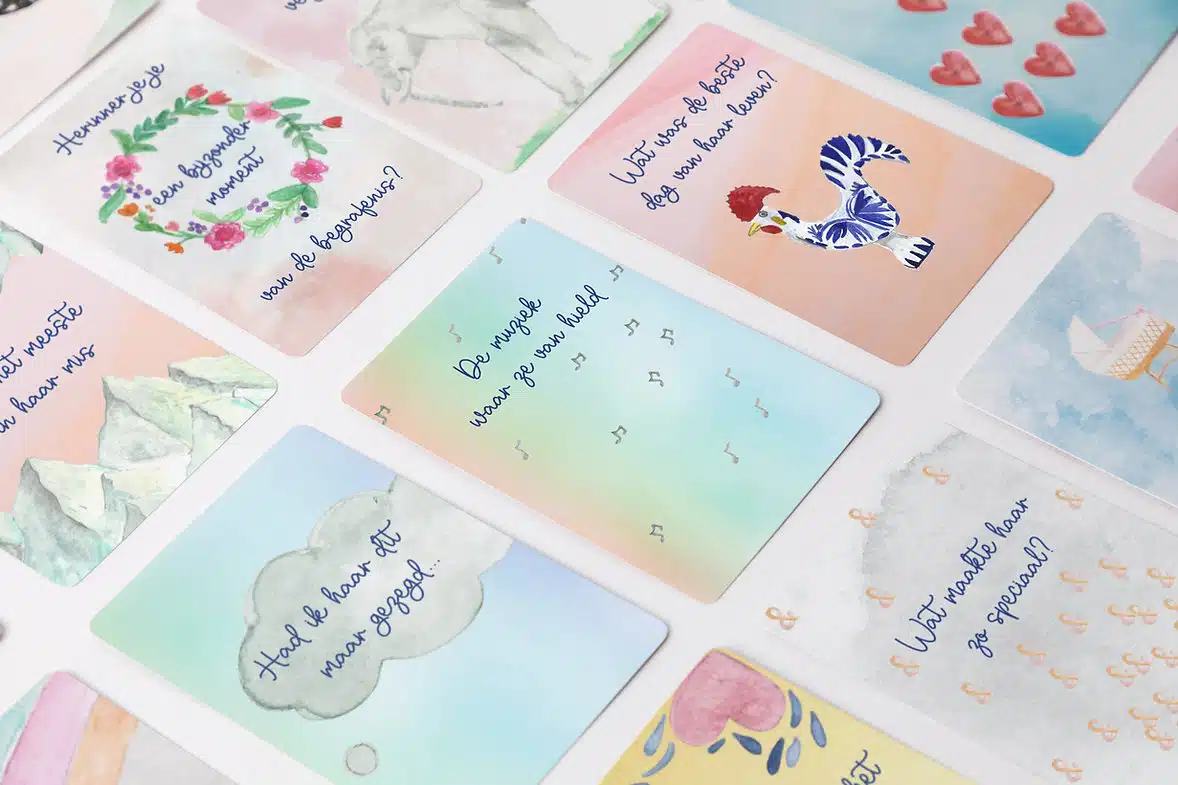 42 kleurrijke kaarten met inspirerende vragen die uitnodigen om het leven te koesteren van een geliefde die je mist.