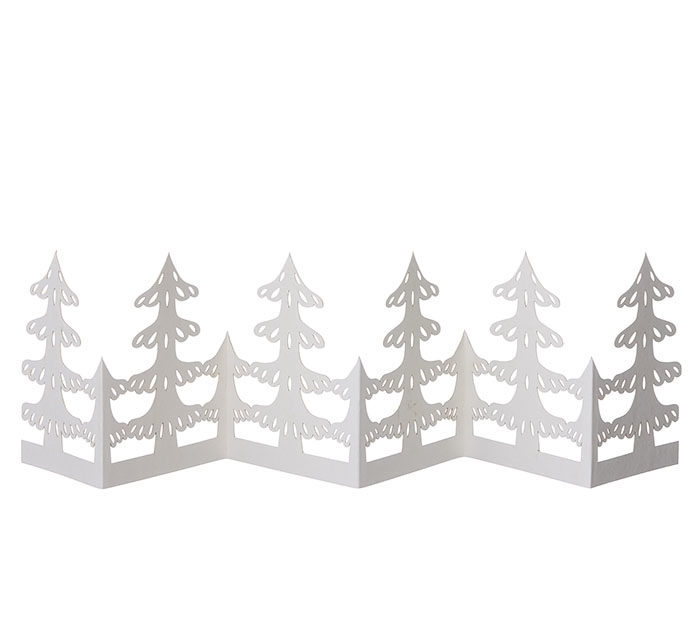 Elegante witte tafelslinger met kerstbomen. Laat deze delicate papieren slinger de sfeer bepalen op uw kersttafel of versier een vensterbank. De elegante papieren decoraties worden in India met een laser gesneden, waardoor veel fijne en nauwkeurige details in het papier mogelijk zijn. Door het lasersnijproces kunnen er kleine brandplekken op de ornamenten ontstaan. Wij zien deze niet als gebreken, maar als onderscheidende kenmerken van de unieke productiemethode.