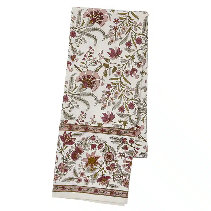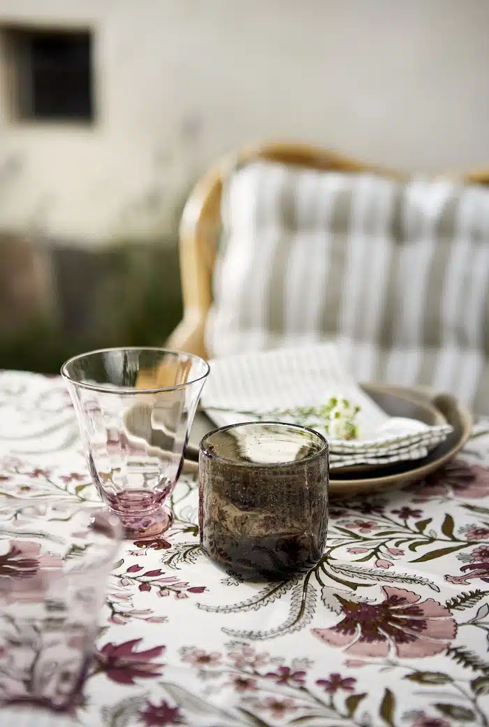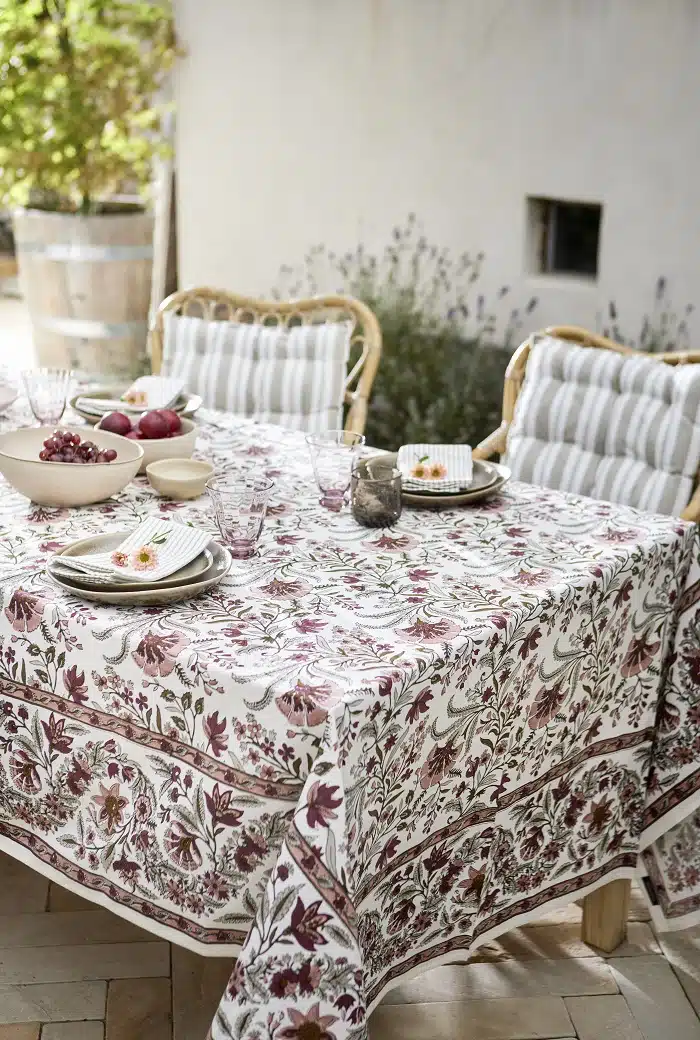 Een prachtig tafelkleed van Bungalow met een blockprint van bloemen in Lily rose.