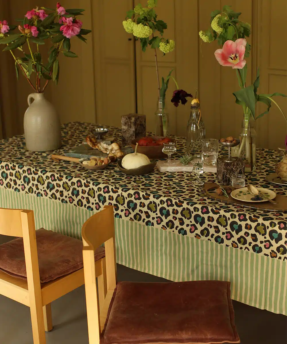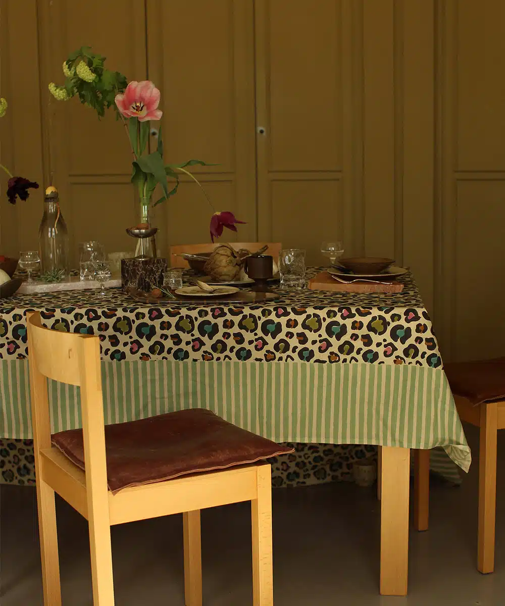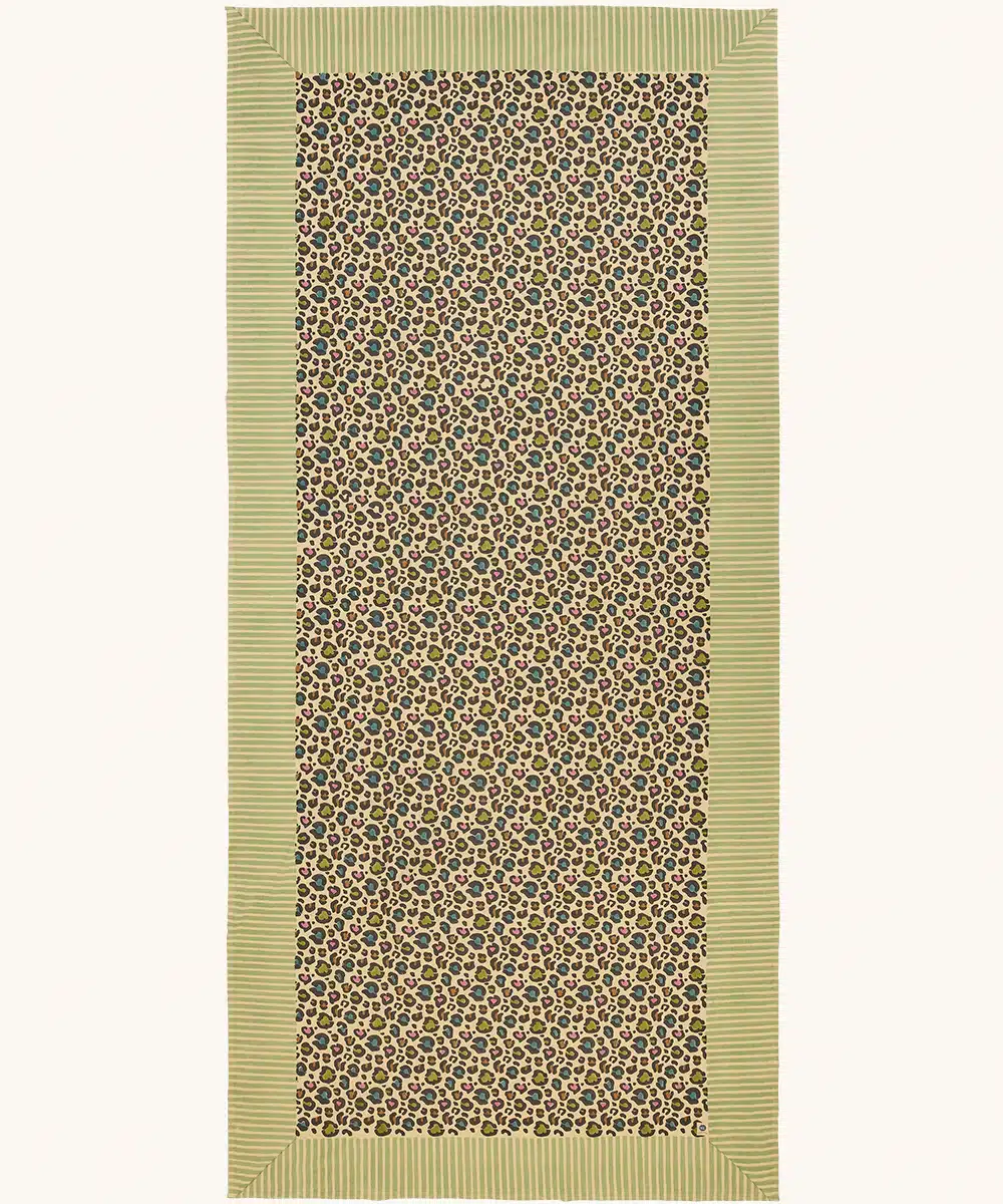 Het Disco Leopard Tafelkleed brengt kleur en karakter in huis én buiten. Met zijn speelse luipaardprint en frisse groene accenten is het een echte blikvanger. Handgemaakt in India met traditionele blockprint-technieken van zacht katoen. Gebruik het als tafelkleed, picknickkleed of strandlaken – altijd stijlvol, altijd veelzijdig. Geleverd in een bijpassende draagtas, klaar voor elk feestje of ontspannen moment.