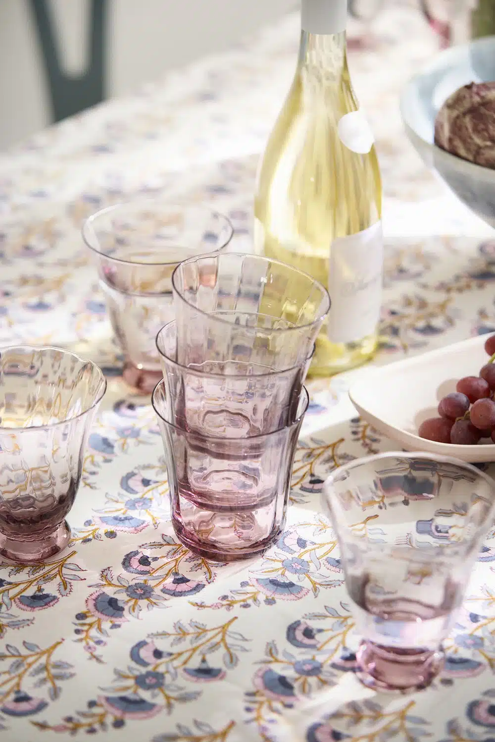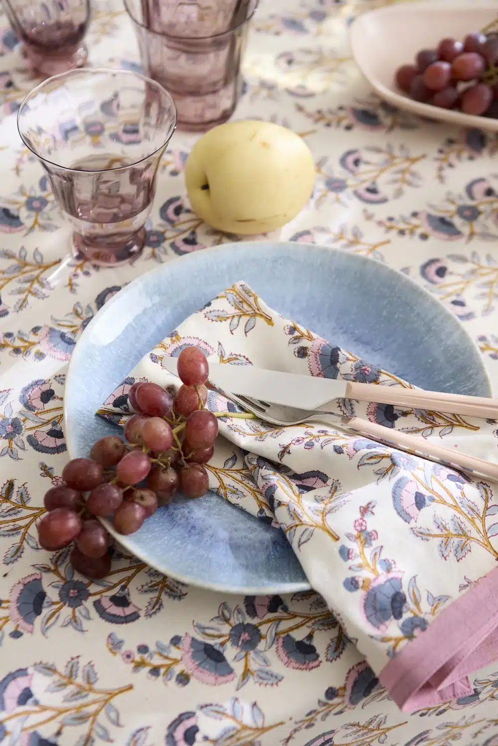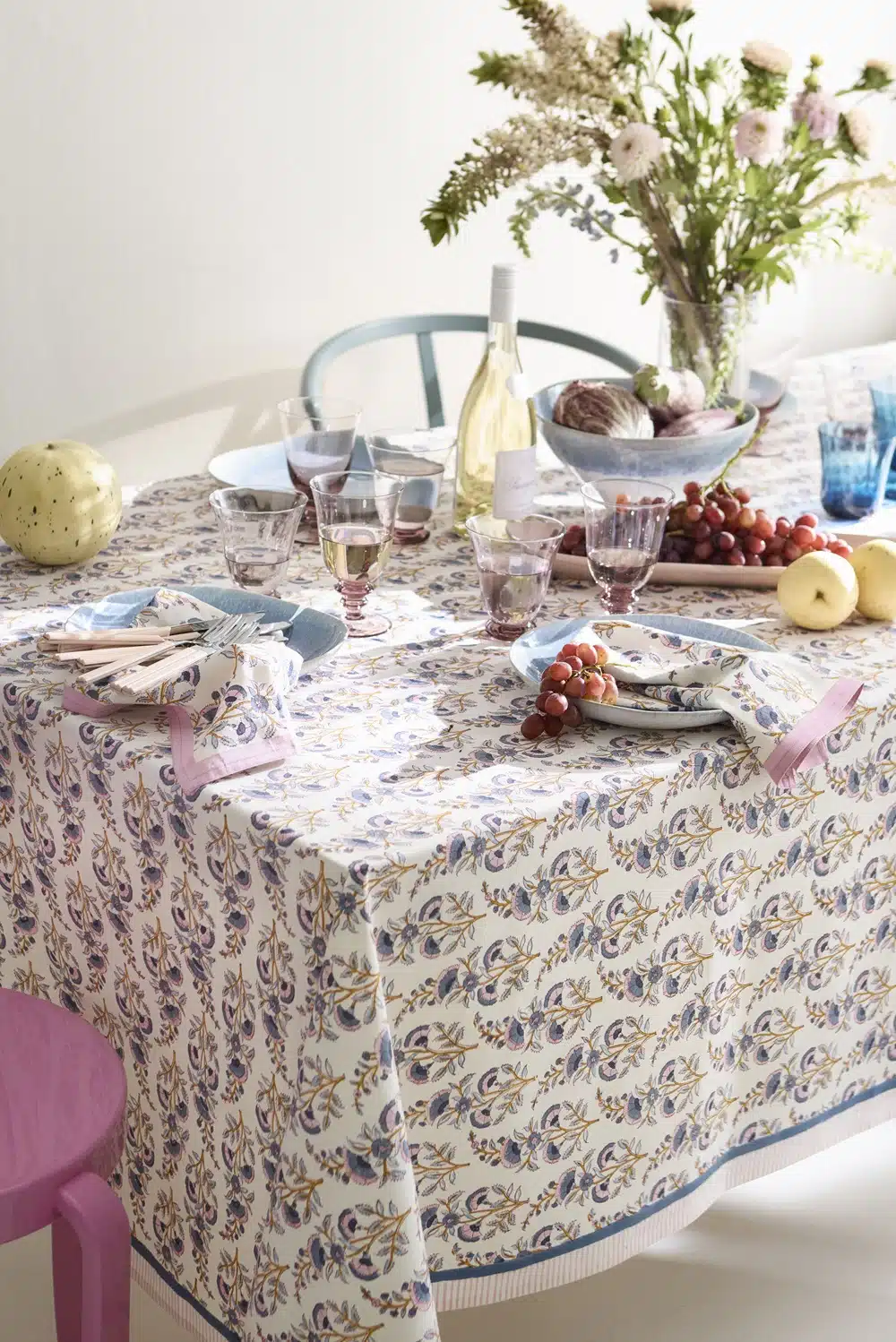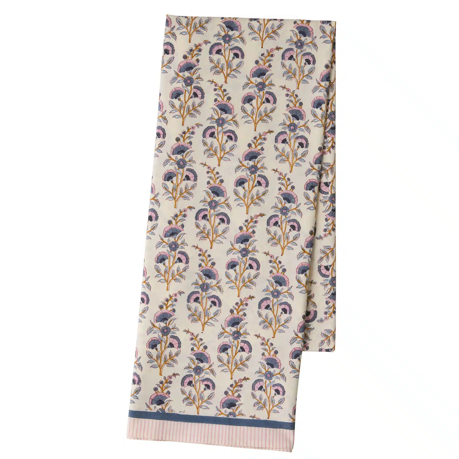 Een prachtig tafelkleed van Bungalow met een blockprint van bloemen in blauw, oker en fris roze. Prachtig als kleed op jouw lente tafel.