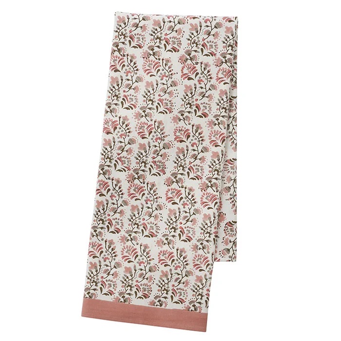 Een prachtig tafelkleed van Bungalow met een blockprint van bloemen in roze met beige accenten.