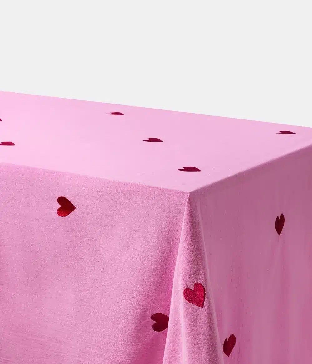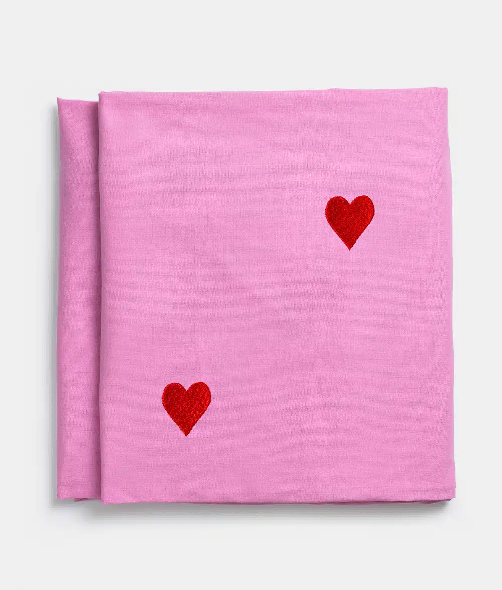 Een zoet roze tafelkleed met geborduurde rode hartjes van het Zweedse Midnatt waarmee je iedere eettafel net dat beetje extra geeft.