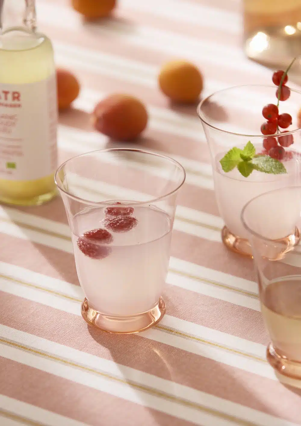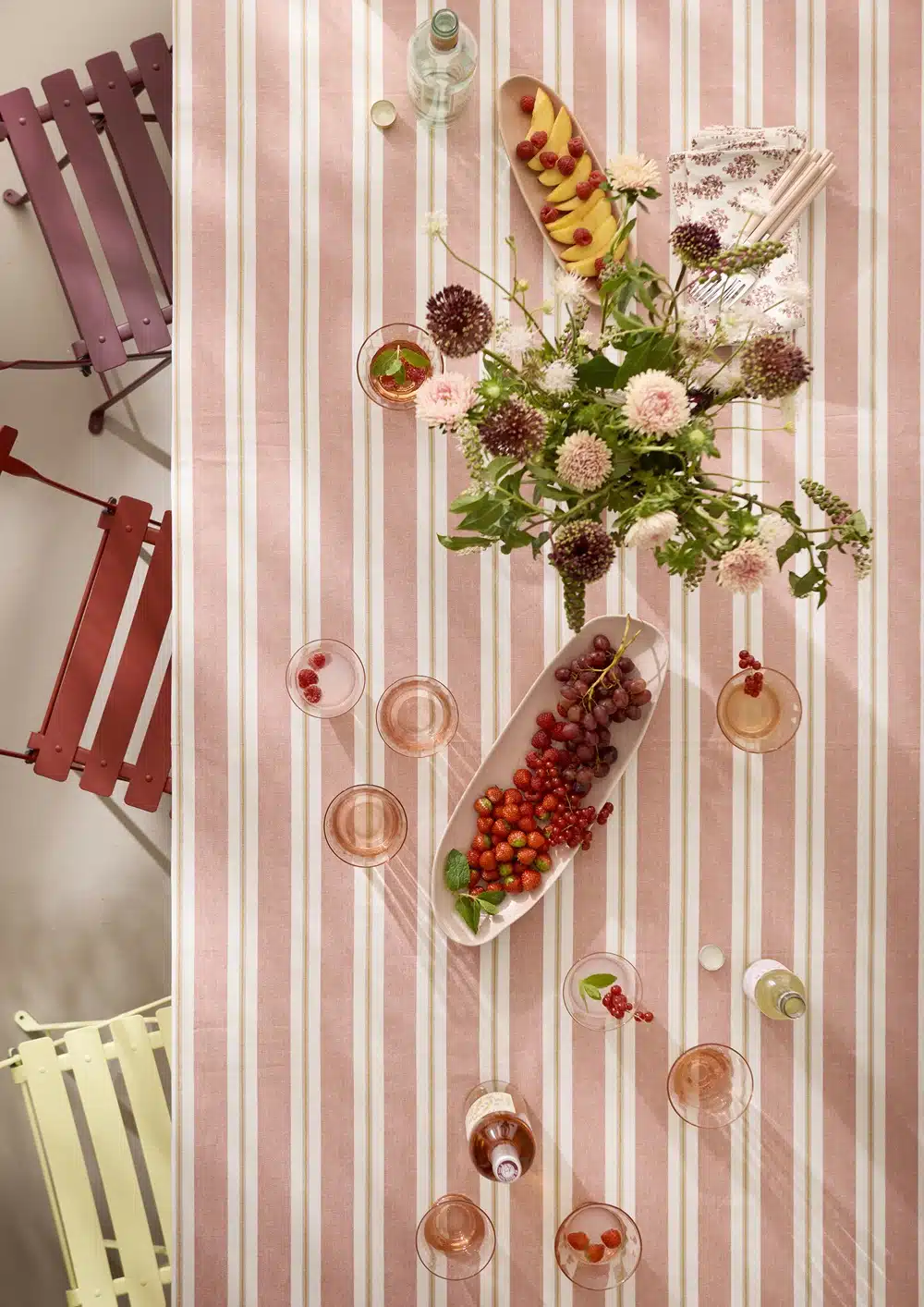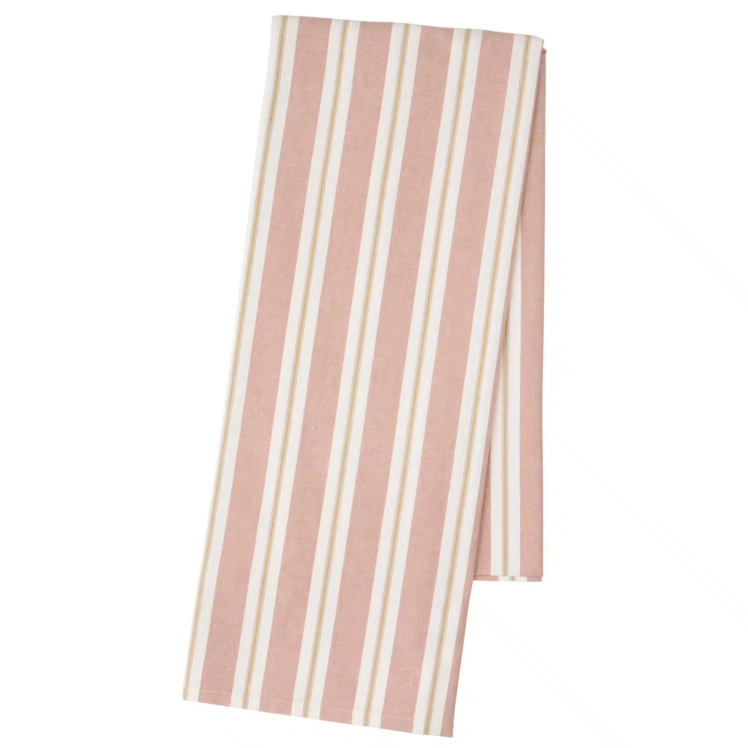 Een lichtroze (grijs en geel) gestreept tafelkleed van 100% geweven katoen.