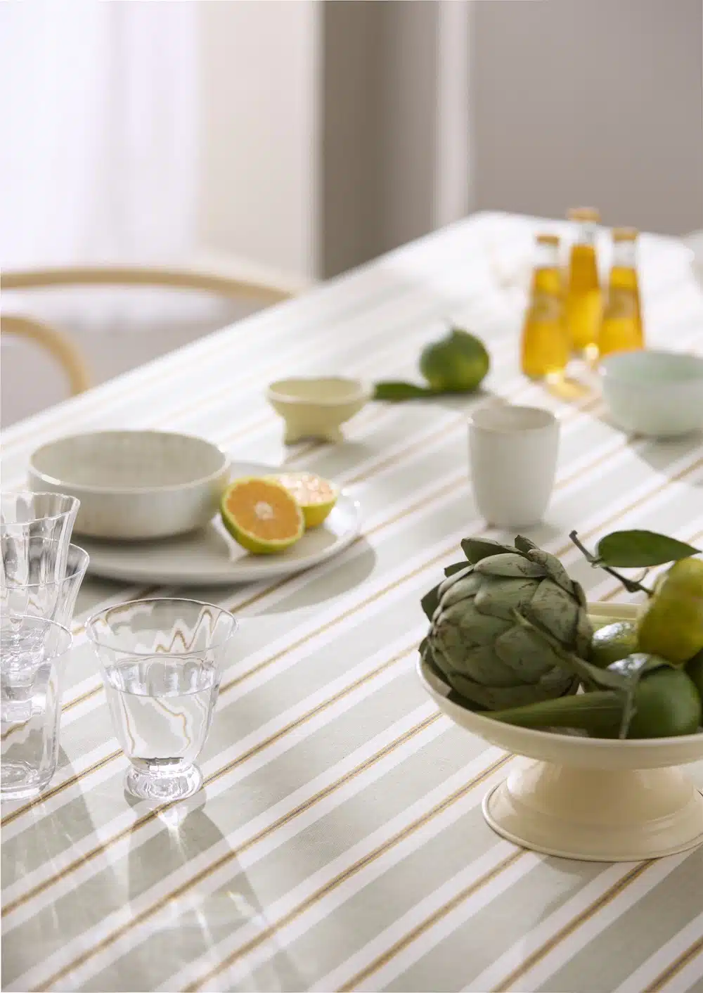 Een zachtgroen en geel gestreept tafelkleed van 100% geweven katoen.