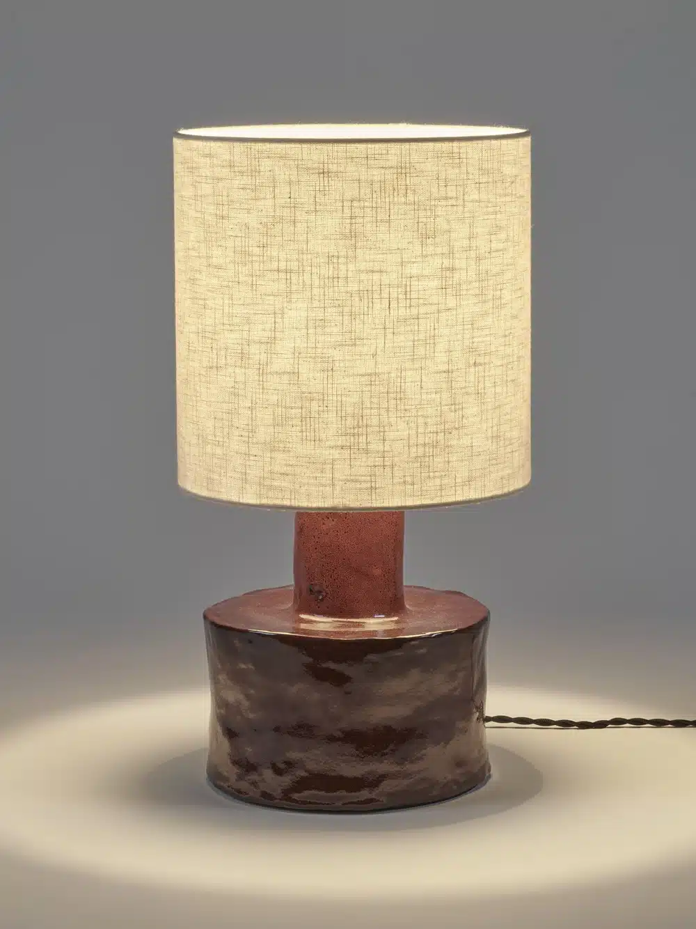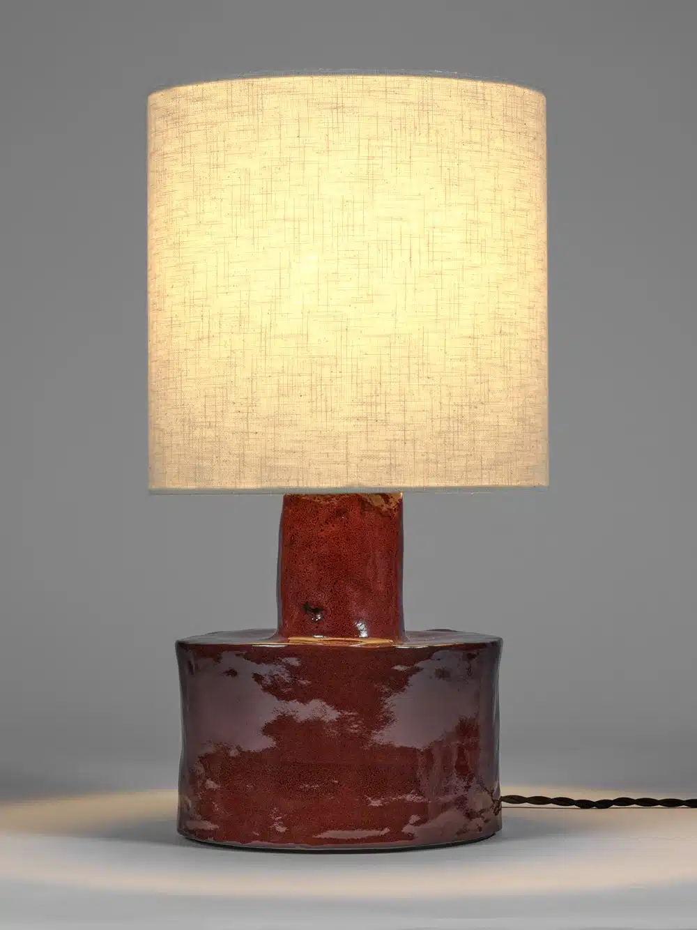 De Catherine tafellamp van aardewerk met voetstuk in warm rode kleur en lampenkap in beige kleur, is een bron van warmte en gezelligheid. Deze tafellamp werd ontworpen door designer Marie Michielssen en straalt met haar onregelmatige vorm pure ambacht uit.