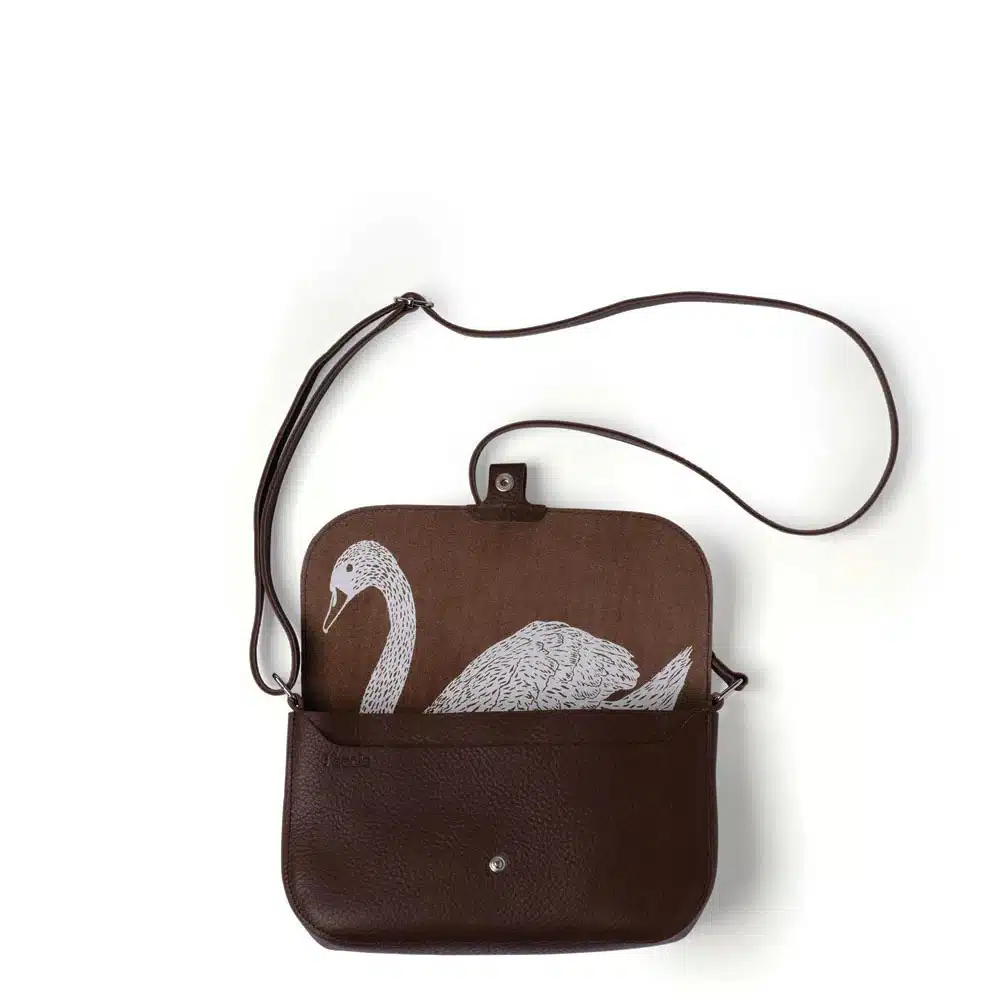 De Wild Swan in bruin leer is een mooie crossbody tas (verstelbare schouderriem) die je outfit een klassiek accent geeft. Binnenin pronkt de print van een sierlijke zwaan, die als stille metgezel met je op avontuur gaat.