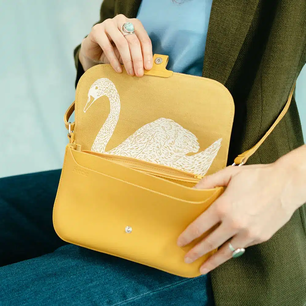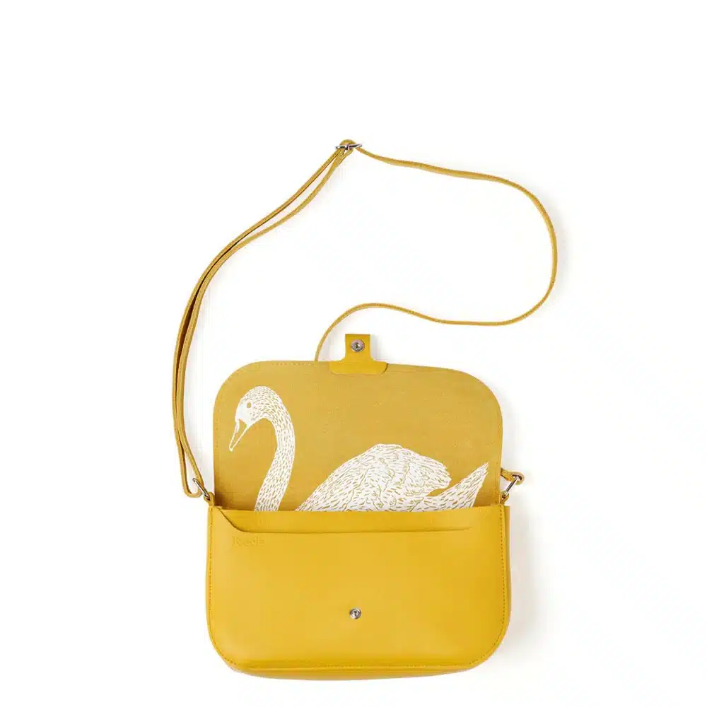 De Wild Swan in geel is een opvallende en vrolijke crossbody tas (verstelbare schouderriem) die je outfit een fris accent geeft. Binnenin pronkt de print van een sierlijke zwaan, die als stille metgezel met je op avontuur gaat.