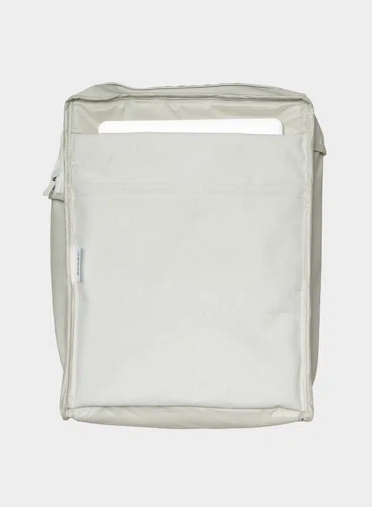 De tas is gemaakt van recycled kwalitatief ripstop nylon met een waterbestendige coating, een neopreen vulling en stevige rits.