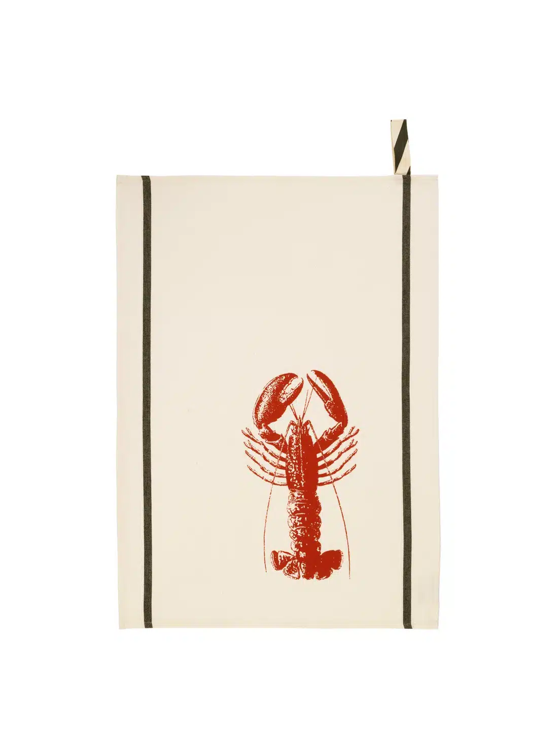 Een mooie theedoek met koraalrode (zeefdruk) kreeft van biologisch katoen.