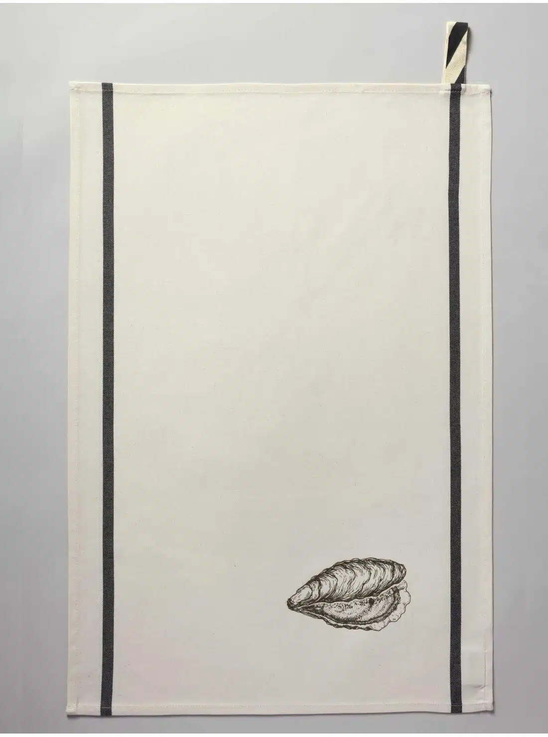 Een mooie theedoek met goudkleurige (zeefdruk) oester van biologisch katoen.