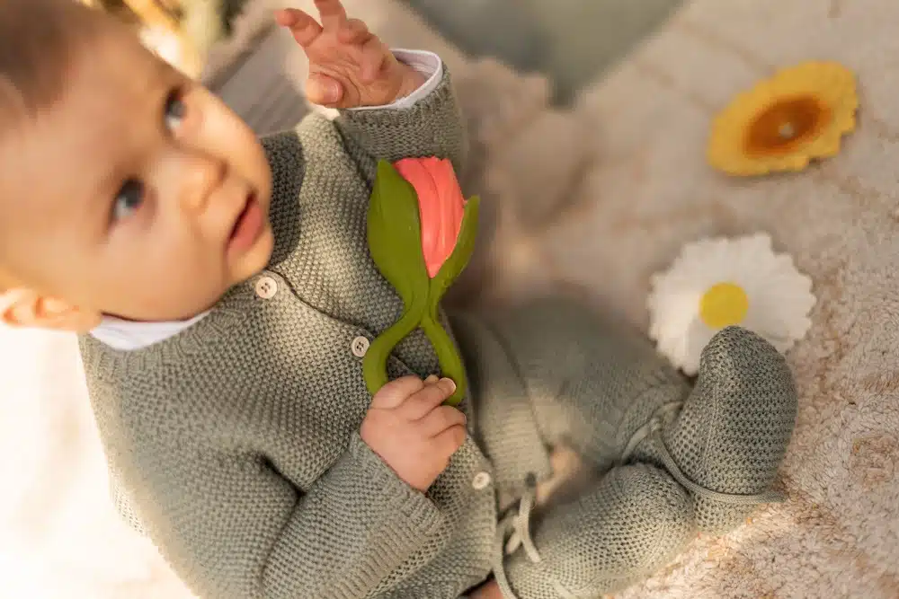 Theo de Tulp is een bijtring, badspeeltje en zintuiglijk speelgoed voor baby’s. Dankzij de ring kunnen de kleine handjes van baby’s gemakkelijk vasthouden terwijl ze op een veilige natuurlijke bijtring kauwen. Een grote verscheidenheid aan texturen stimuleert ook de zintuigen van baby’s en kalmeert het tandvlees.