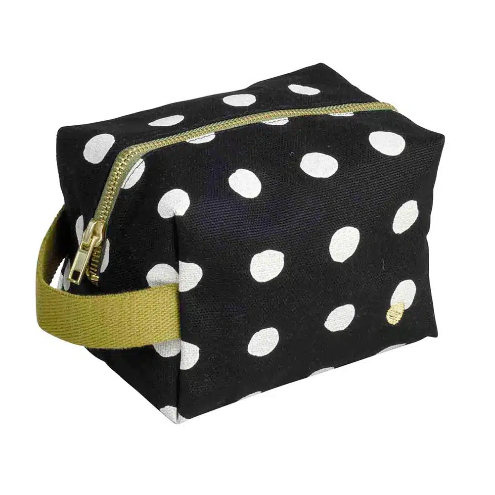 Deze pouch is gemaakt van stevig katoen met een gecoate binnenkant, katoenen hengsel en een goud geborduurde polkadot.