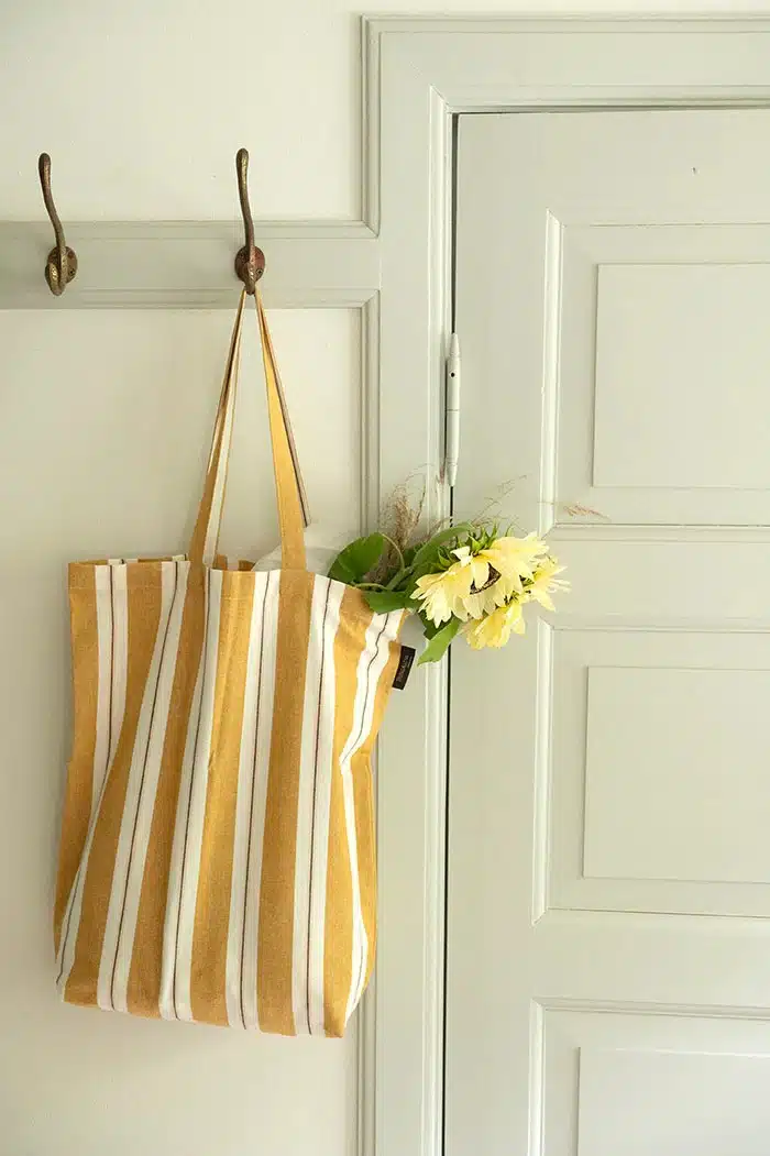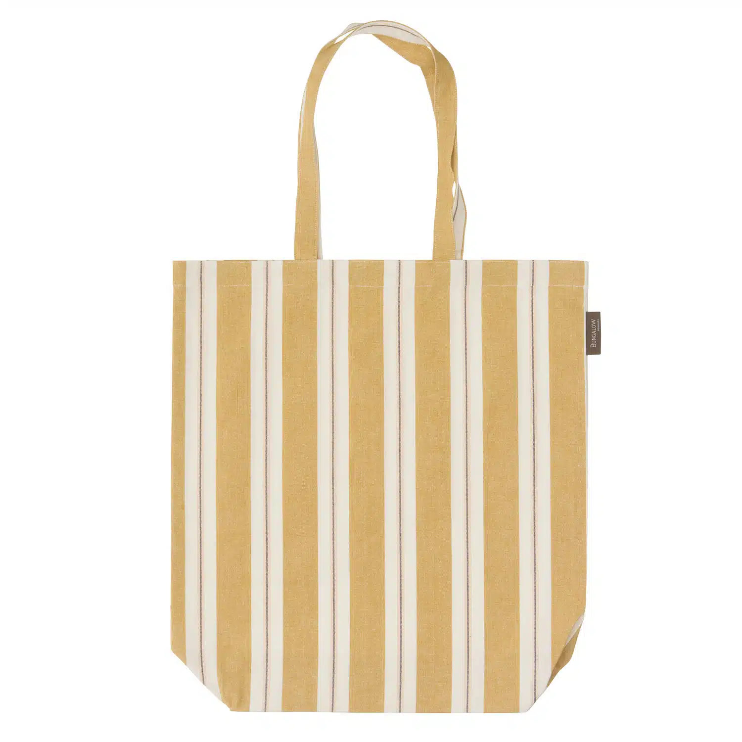 Een sterke, vrolijke, canvas tas met gele strepen, gemaakt van 100% katoen.