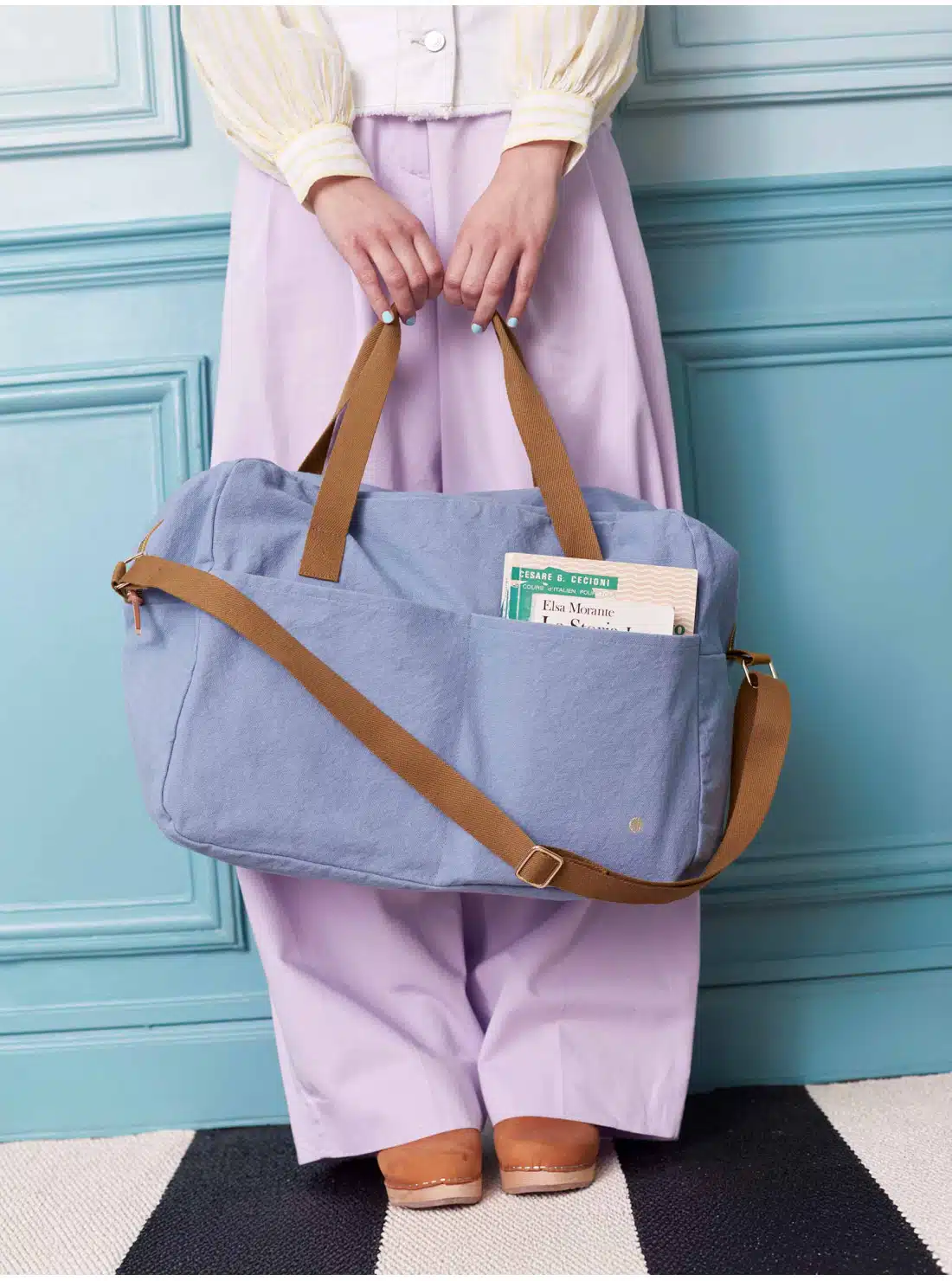 • Afwerking: ritssluiting, twee korte (64 cm), één lange (115 cm) katoenen handvatten en Oscar ecru gouden binnenkant