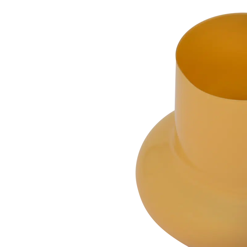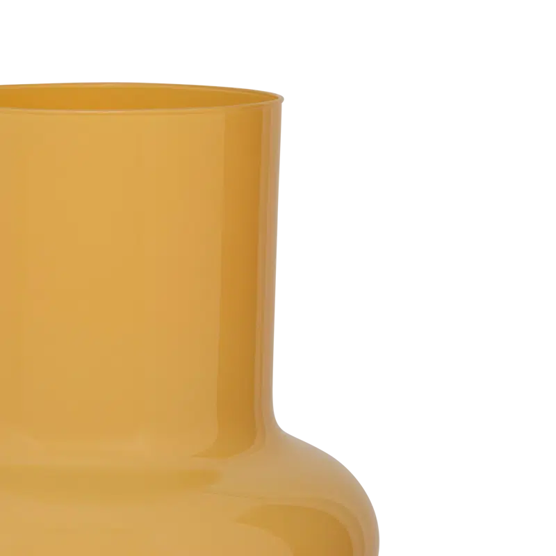 Een opvallende vaas van ondoorzichtig gerecycled glas, gekleurd in een warme zonsondergangsgoud. De stevige, bolvormige voet en rechte bovenkant zorgen voor een eenvoudig maar krachtig silhouet. Een opvallende statement piece voor een verse bos bloemen.