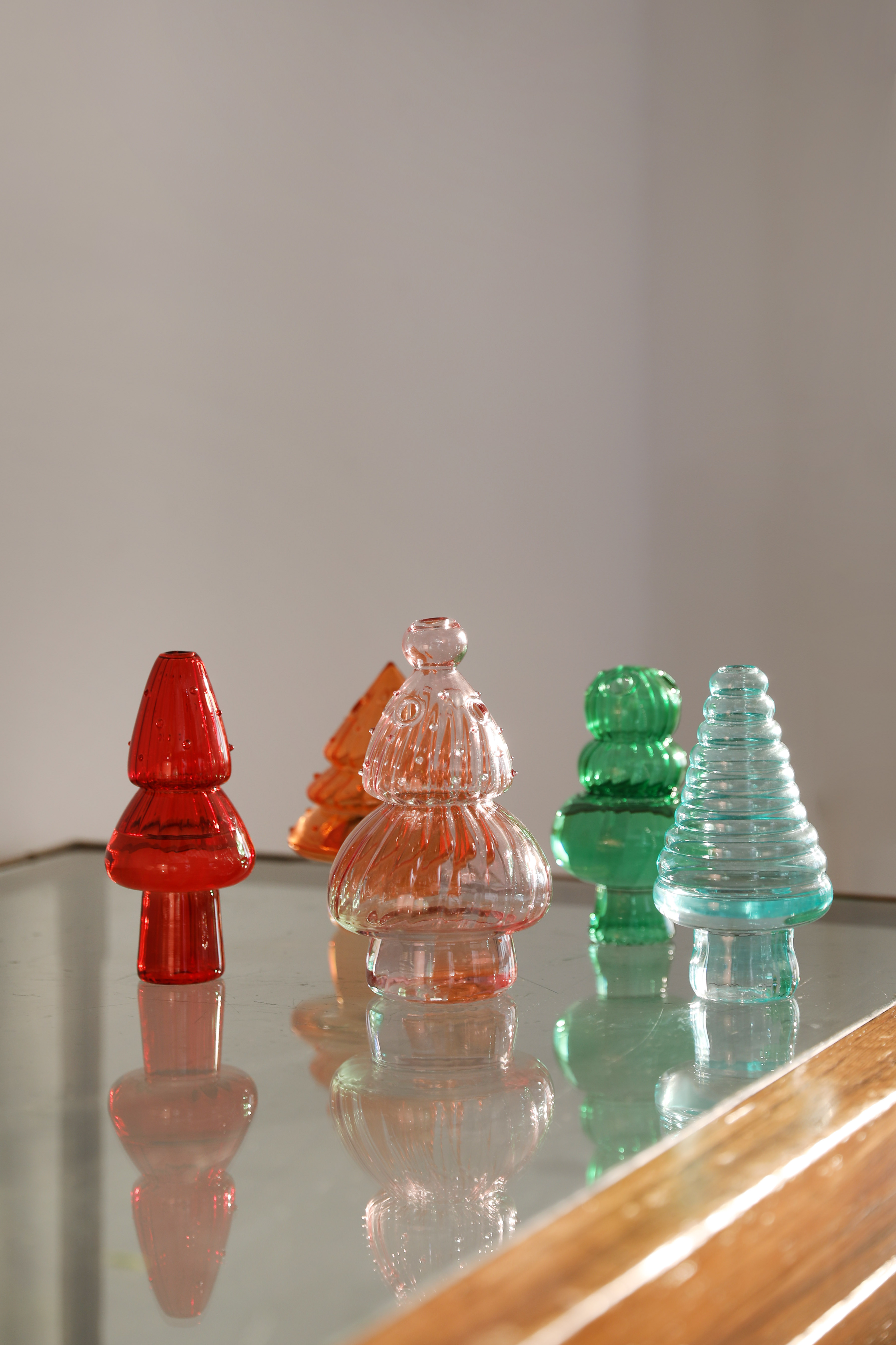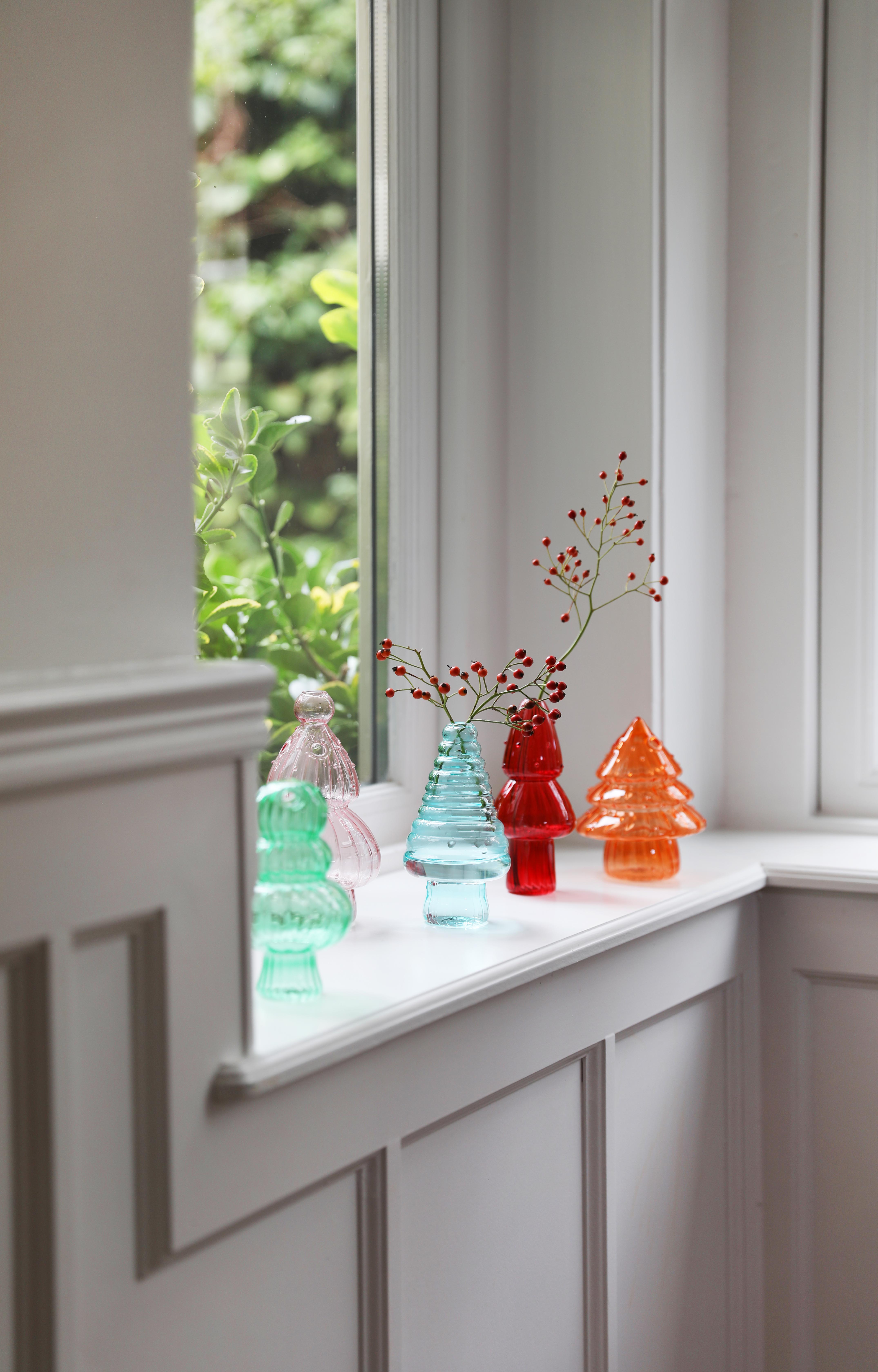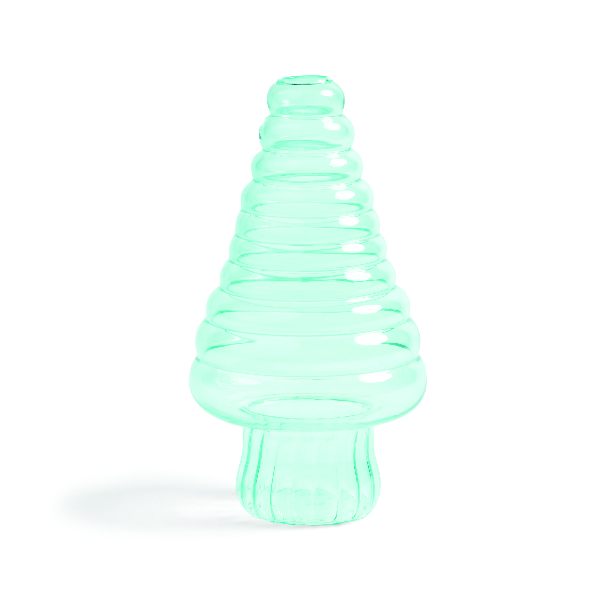 Een blauw vaasje in de vorm van een boom, gemaakt van gekleurd glas. Een ontwerp van het Amsterdamse merk &klevering en verkrijgbaar in 5 verschillende kleuren.