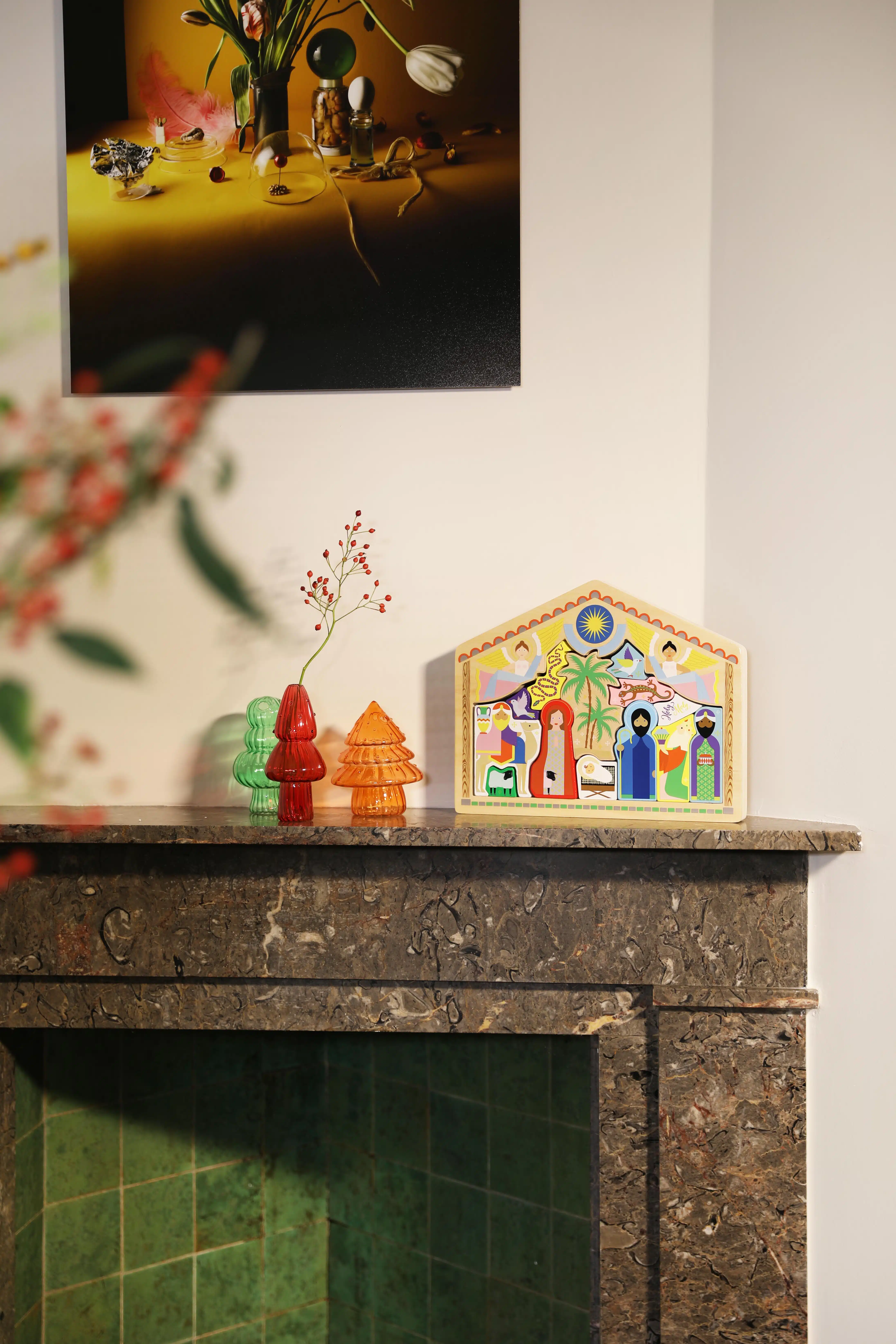Een groen vaasje in de vorm van een boom, gemaakt van gekleurd glas. Een ontwerp van het Amsterdamse merk &klevering en verkrijgbaar in 5 verschillende kleuren.