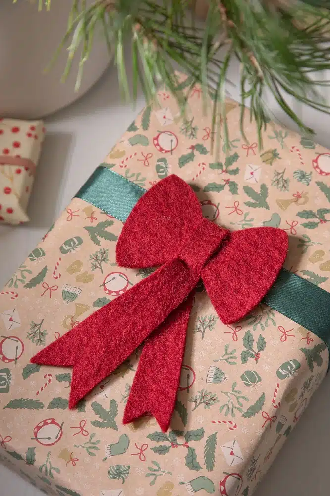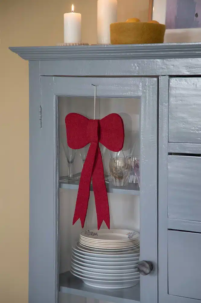 Een klassieke rode strik van vilt voor in de kerstboom of om de tafel (servetring) of een cadeautje mee te decoreren.