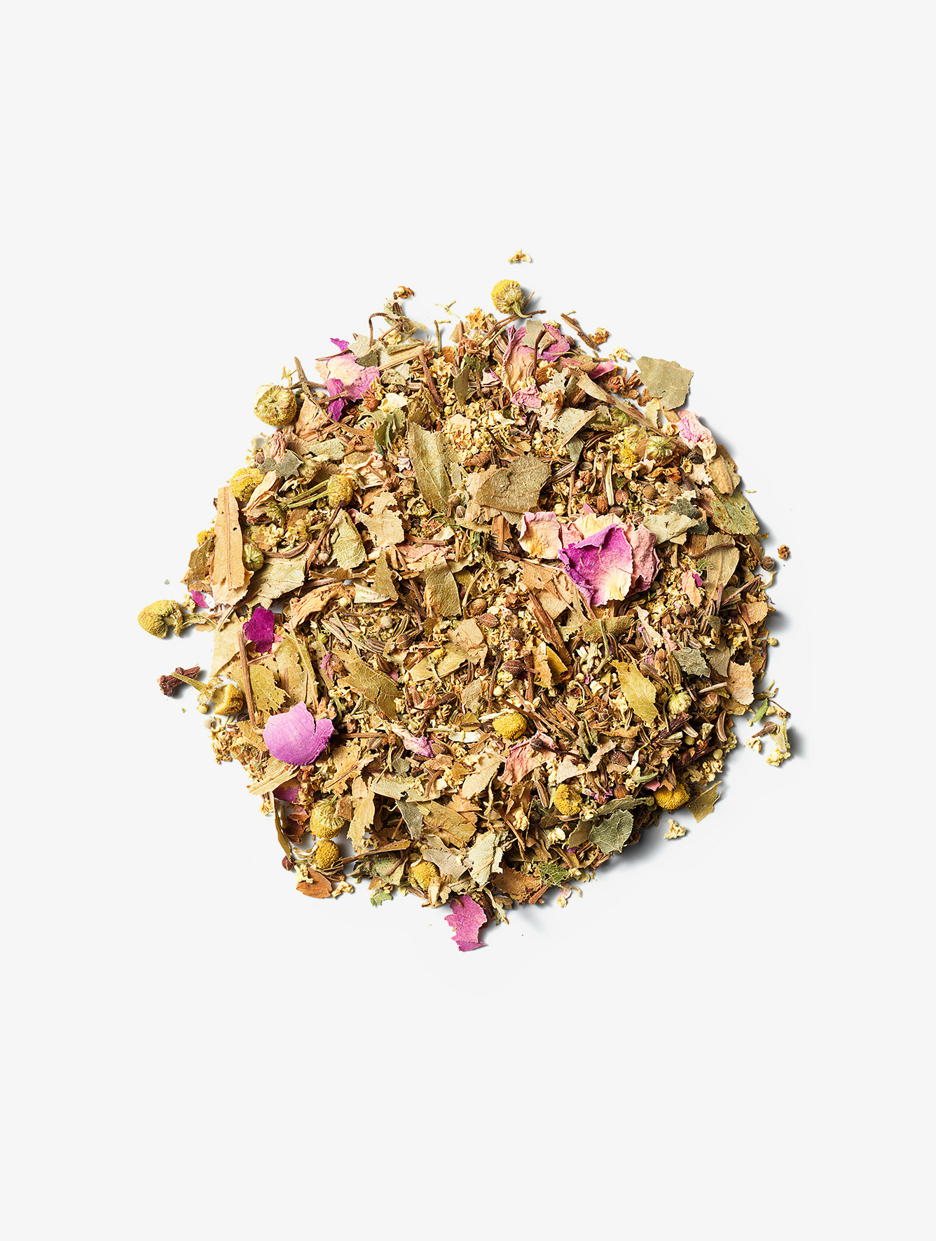 Lindebloesem, vlierbloesem, kamille, karwij, rozenblad