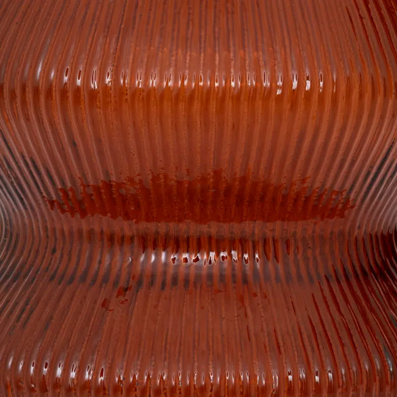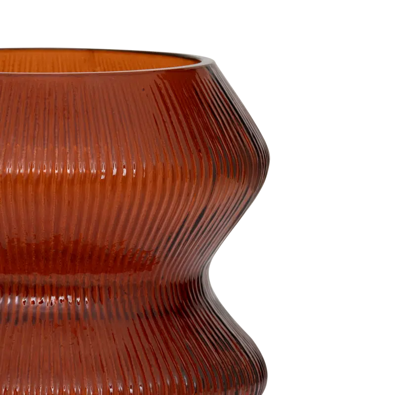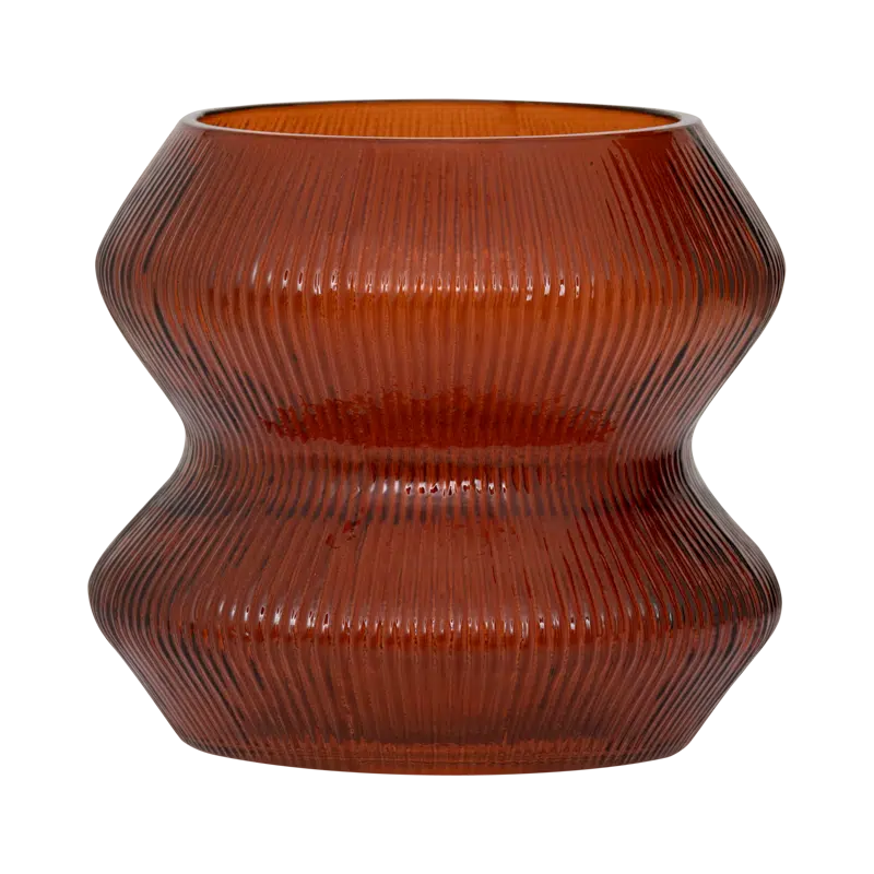 Deze stralende en vrolijke theelichthouder in diep oranje straalt de warmte van een gloeiende zondsondergang uit. Gemaakt van gerecycled glas. Het golvende ontwerp en de gestructureerde lijnen geven uw interieur een levendige uitstraling.